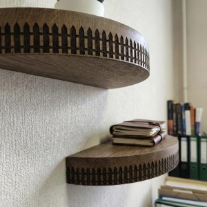 Vintage wood shelf with hand cut bracket details and aged patina, solid wooden wall mounted display shelf.
